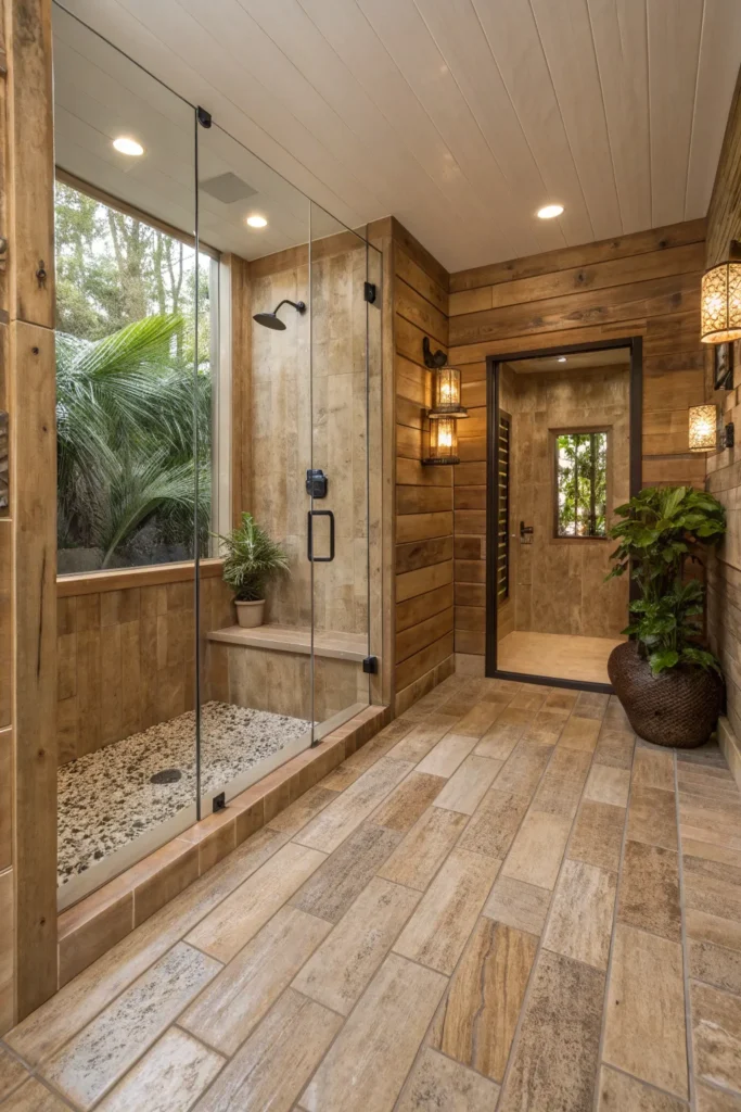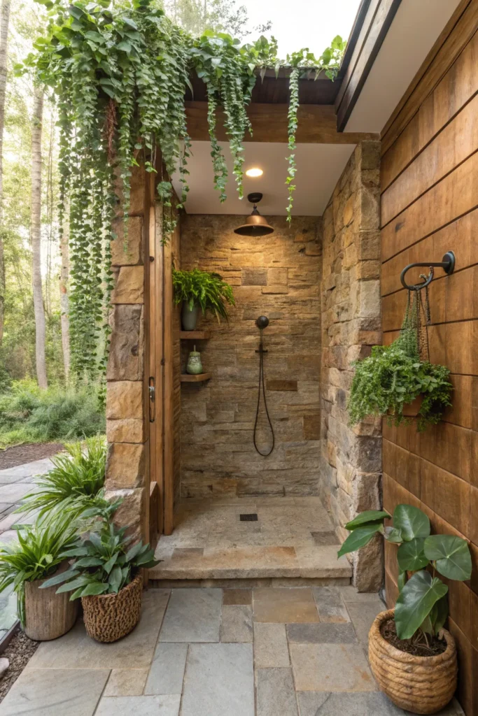 Greenery softens stone and wood textures, bringing a fresh outdoor feel. Add hanging plants, eucalyptus, or small pottery planters near the shower.