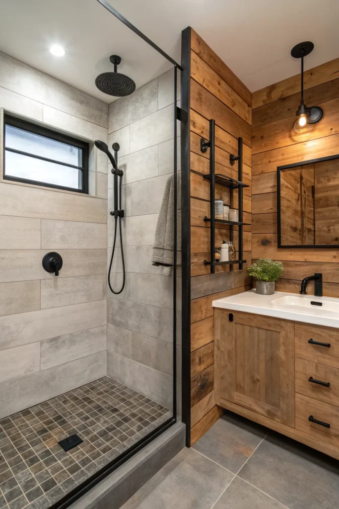 If you love wood walls but want low maintenance, wood-look porcelain tile is the perfect rustic solution. It mimics the warmth of timber without moisture concerns.