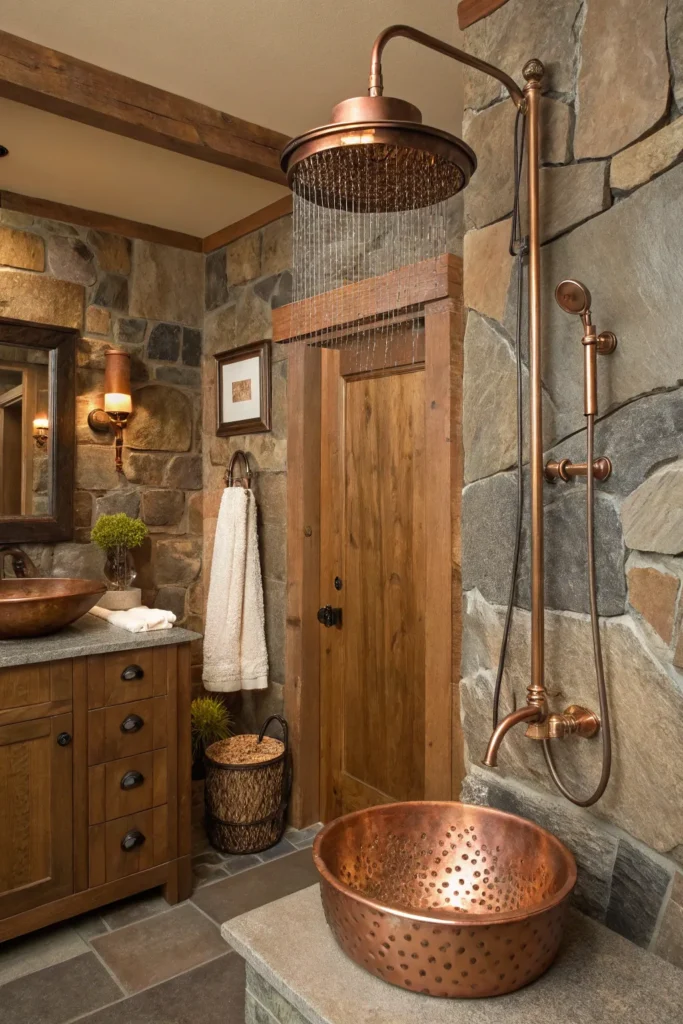 Copper instantly adds warmth, patina, and rustic luxury. Choose a copper shower head, handles, or even a hammered copper basin for nearby vanity areas.
