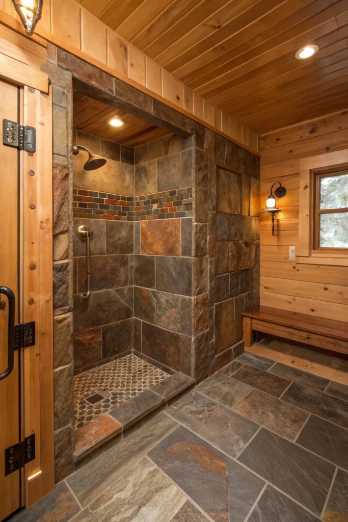 Slate tiles bring rich earth tones and subtle texture to walk-in showers. They work for feature walls or full-shower applications, giving a cozy mountain-cabin vibe.