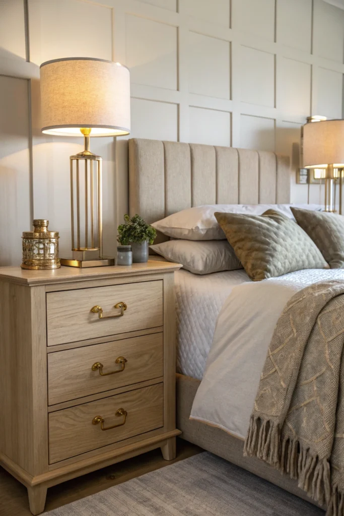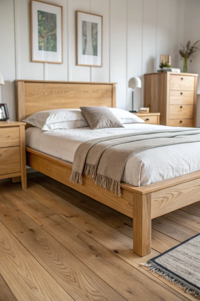 Consider a substantial wooden bed frame with visible grain patterns, floating shelves in light oak, or a beautiful wooden bench at the foot of your bed. Hardwood flooring in natural finishes establishes foundational warmth that anchors the entire room.