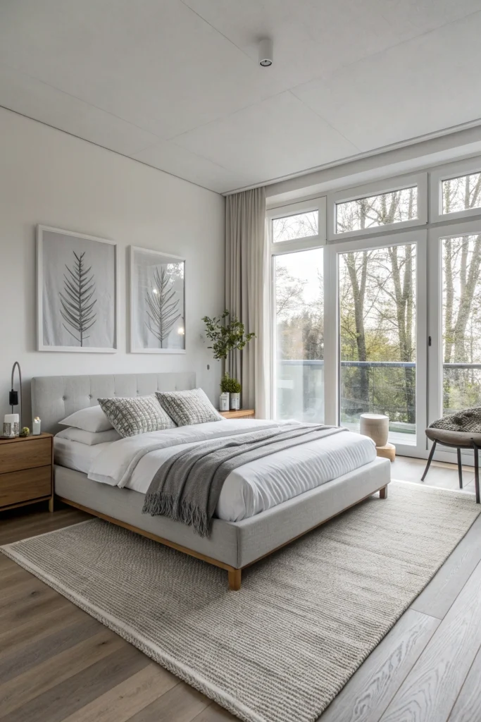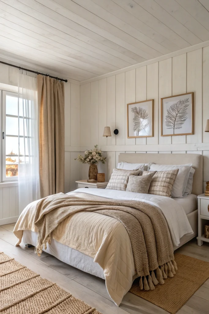 Build your color scheme in layers within this warm neutral foundation. Consider an off-white ceiling, slightly warmer walls, and natural wood flooring creating gentle tonal progression. Add bedding in layered neutrals—perhaps stone-colored linen sheets, a cream duvet, a taupe throw, and pillows mixing whites, beiges, and soft grays.
