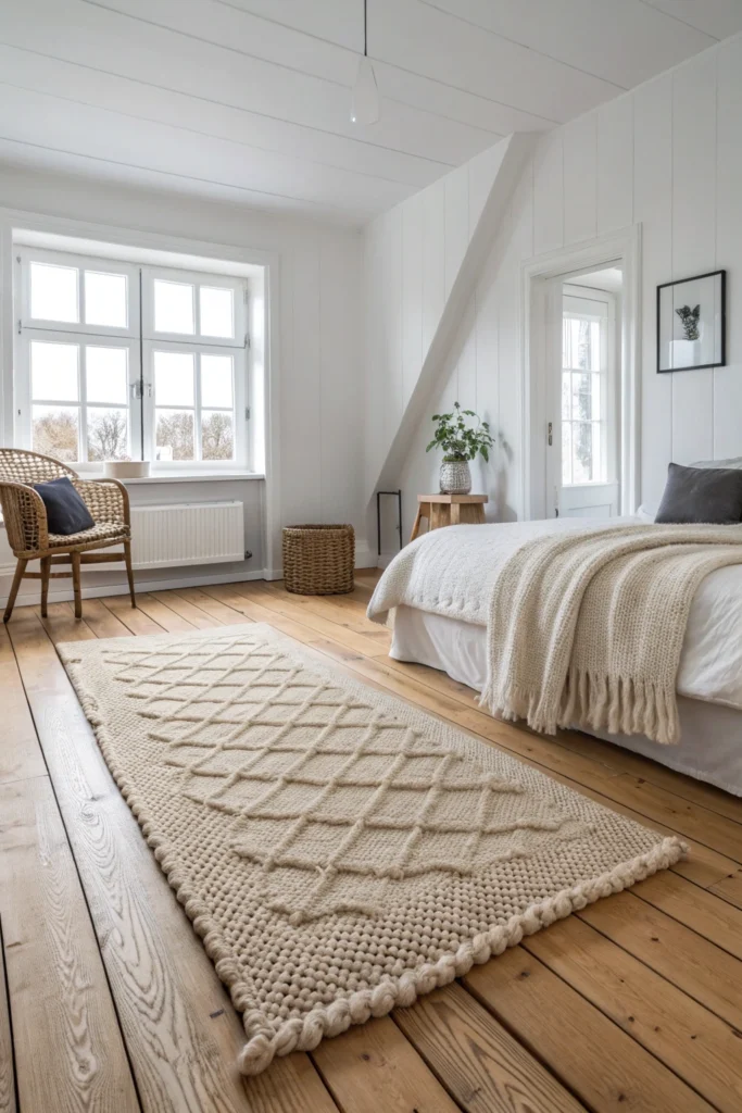 Extend this layering beyond the bed. Place a substantial wool or jute rug beside the bed where your feet land each morning. Drape a knitted throw over a reading chair. Add linen curtains that pool slightly on the floor. Include cushions in different weaves and weights.