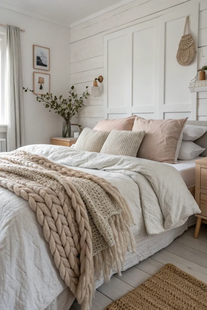 Textile layering transforms Scandinavian bedrooms from minimalist to magnificently cozy. Start with your bed as the focal point for textile abundance—crisp linen sheets, a chunky knit blanket, a lightweight duvet, a textured bedspread, and an assortment of pillows in varied fabrics create inviting depth. Mix materials freely—smooth cotton with nubby wool, soft velvet with crisp linen, fluffy sheepskin with woven throws.