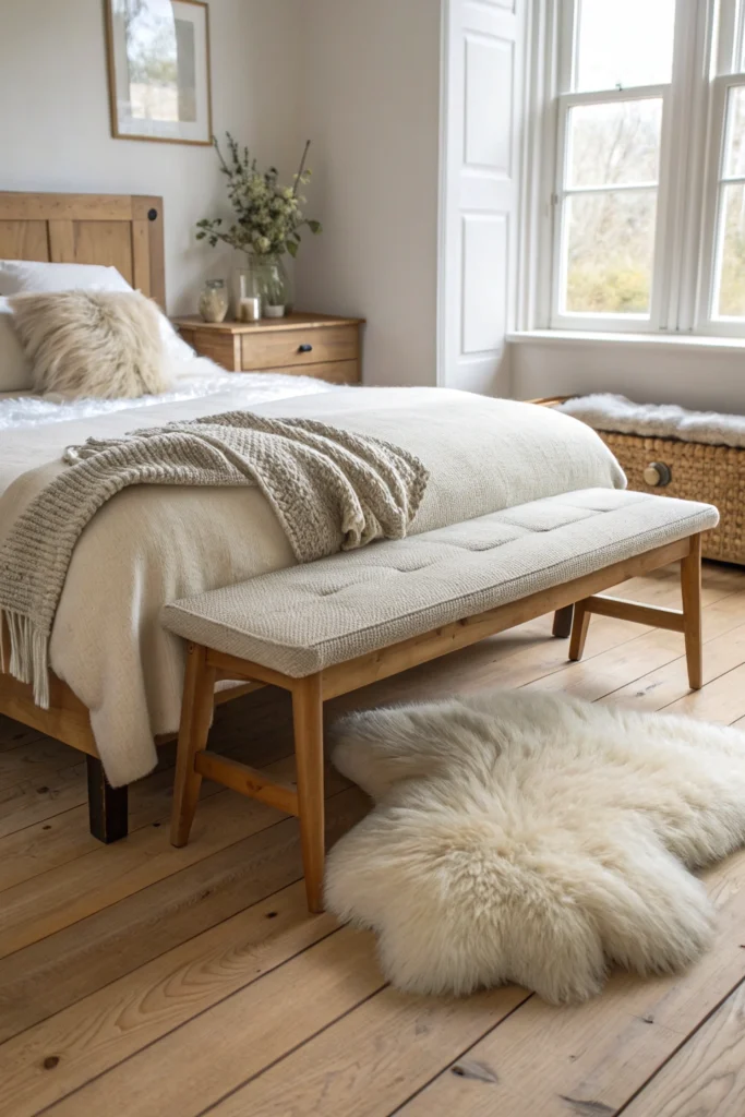 Flooring significantly impacts perceived warmth. Even with beautiful hardwood, substantial natural fiber rugs add essential texture and comfort. Jute, sisal, wool, and seagrass rugs in warm tones create organic foundations that feel wonderful underfoot while visually warming spaces. Layer rugs for additional coziness—perhaps a large jute rug anchoring the room with a softer sheepskin or wool rug layered on top beside the bed.