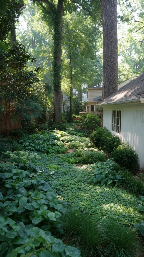 The groundcover approach eliminates mowing in problematic shade while the complete coverage prevents erosion and moderates soil temperatures. Mulch between new plantings preventing weeds during establishment, water consistently until roots establish, then enjoy low-maintenance coverage.