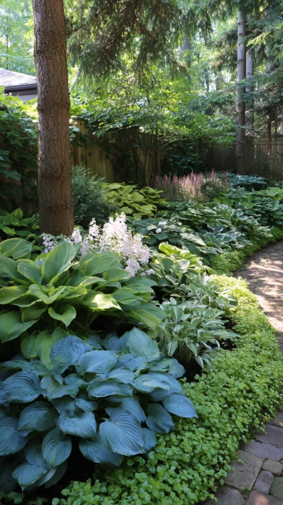 The varied foliage colors from blue to gold to variegated create diversity while mounding forms provide structure. Accept that hostas may struggle in Deep South regions with extreme heat but perform adequately in Upper South locations with slightly milder summers.