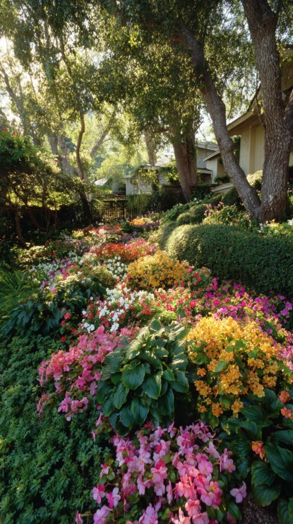 Create continuous summer color using shade-loving annuals including impatiens, begonias, and coleus blooming or providing colorful foliage prolifically despite shade when consistent moisture is maintained. Plant generously creating substantial drifts of color rather than scattered specimens, maintain adequate moisture preventing the wilt these plants experience during dry periods, and deadhead regularly encouraging continued bloom.