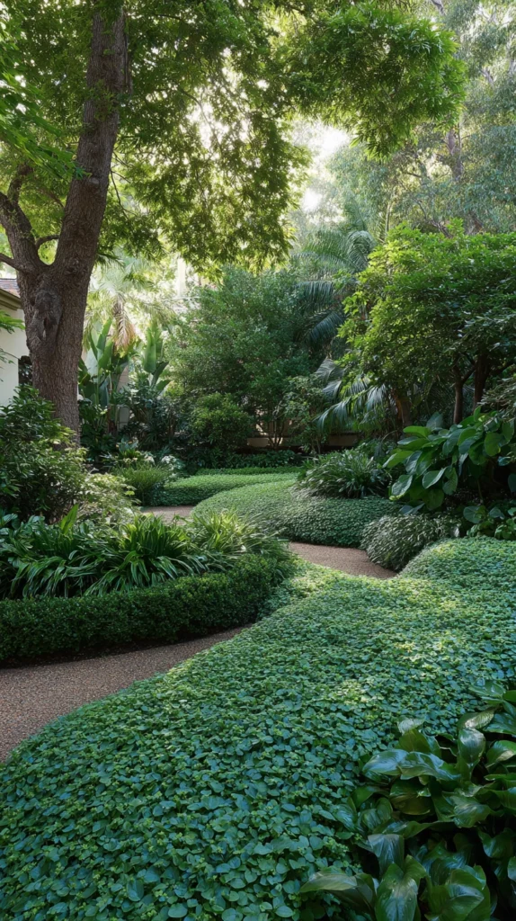 Establish low-maintenance ground layers using shade-tolerant groundcovers eliminating lawn maintenance in shaded areas where turfgrass struggles while creating living green carpets. Plant mondo grass, liriope, ajuga, or pachysandra creating dense coverage that suppresses weeds once established, choose native groundcovers like wild ginger or partridgeberry supporting local ecosystems, or use shade-tolerant sedges creating fine-textured carpets.