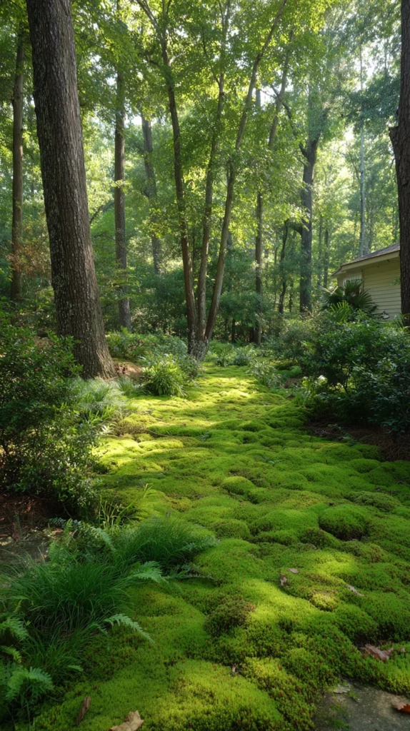 The naturalistic approach reduces maintenance while the moss and ferns thrive in conditions many conventional shade plants find challenging. Accept that moss requires consistent moisture during establishment but tolerates considerable shade and heat once established in appropriate locations.