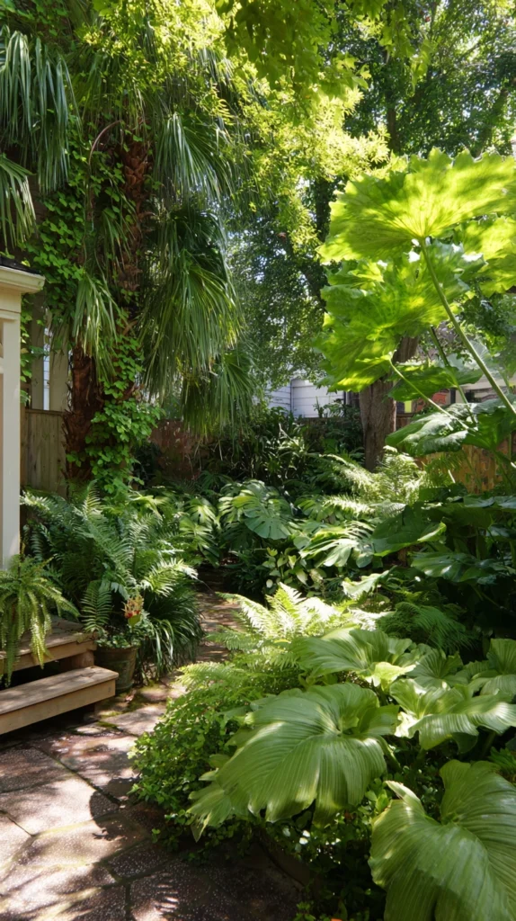 Create lush jungle atmospheres using shade-tolerant tropical and subtropical plants featuring bold foliage that handles southern heat while thriving without direct sun exposure. Plant elephant ears (Colocasia, Alocasia) providing dramatic large-leaved statements, add gingers including shell ginger or hidden lily tolerating shade while offering exotic foliage and flowers, incorporate begonias providing both foliage interest and flowers, and use tropical ferns creating complete layered understory plantings.