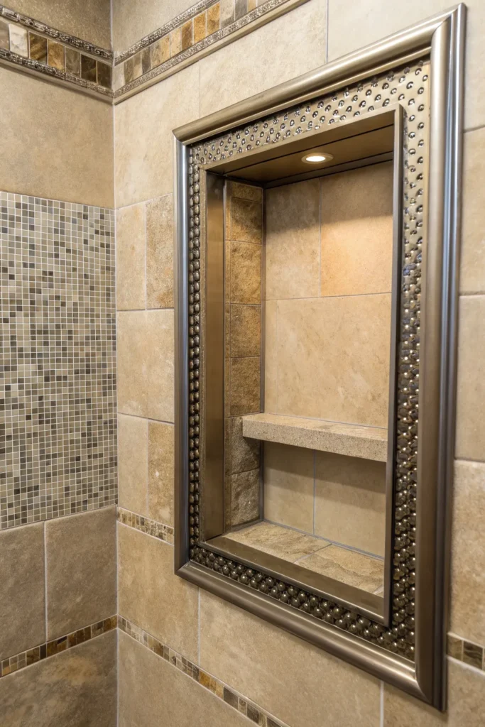 Framing a shower niche with metal trim or stone edging adds crisp definition and a tailored look. Thin metal frames in brushed brass, chrome, or matte black elevate the niche without overwhelming it.