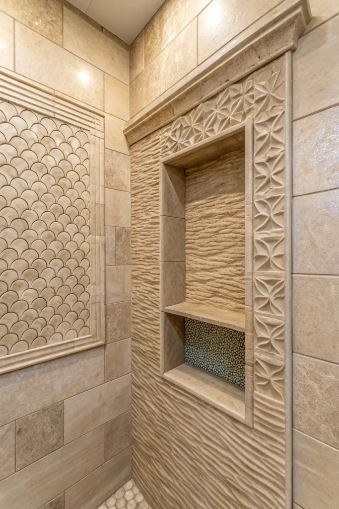 Textured tiles inside the niche add dimension without bold color contrast. Fluted, ribbed, or handcrafted tiles introduce tactile interest that enhances the luxurious feel.