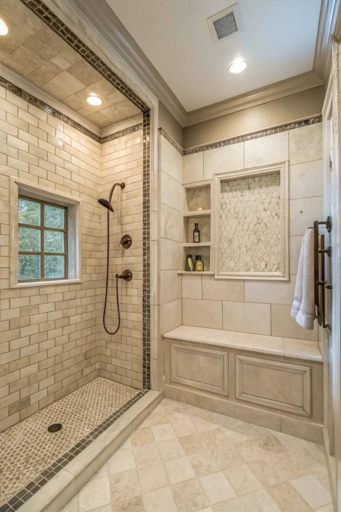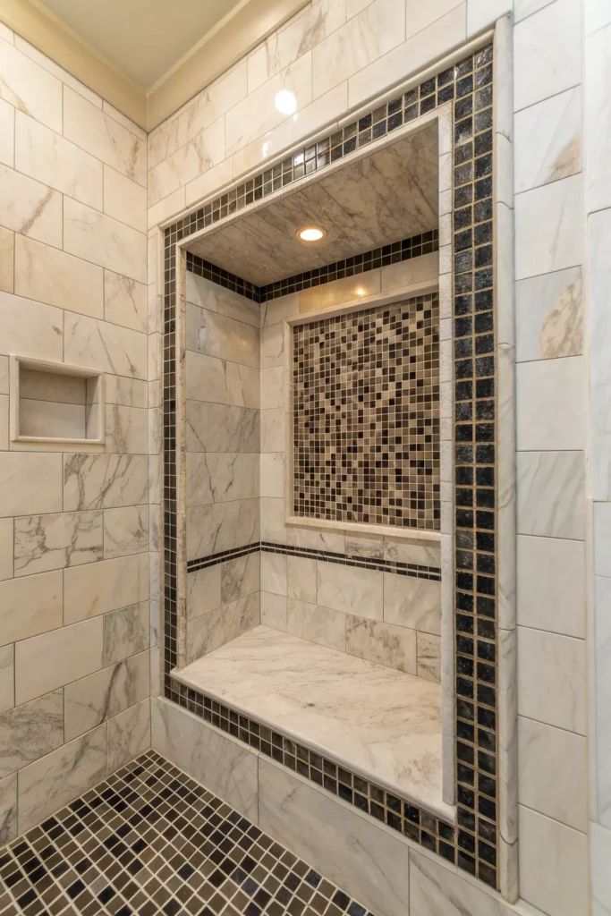 The contrast adds depth and visual interest, instantly making the niche feel intentional and upscale. Keeping the rest of the shower simple ensures the niche feels luxurious rather than overwhelming.
