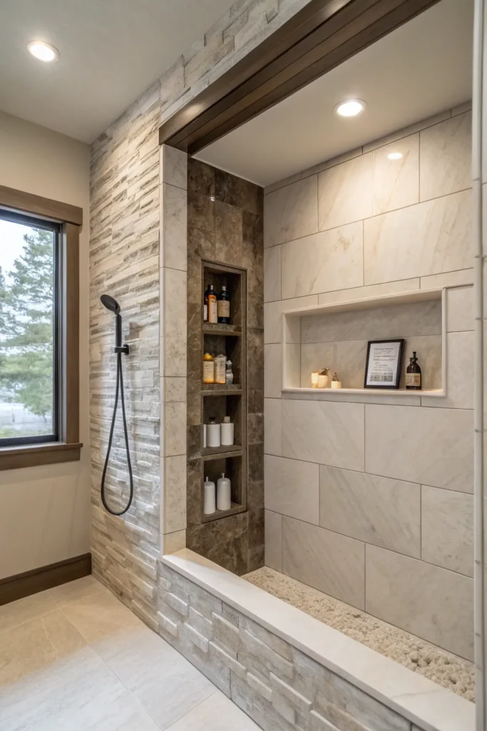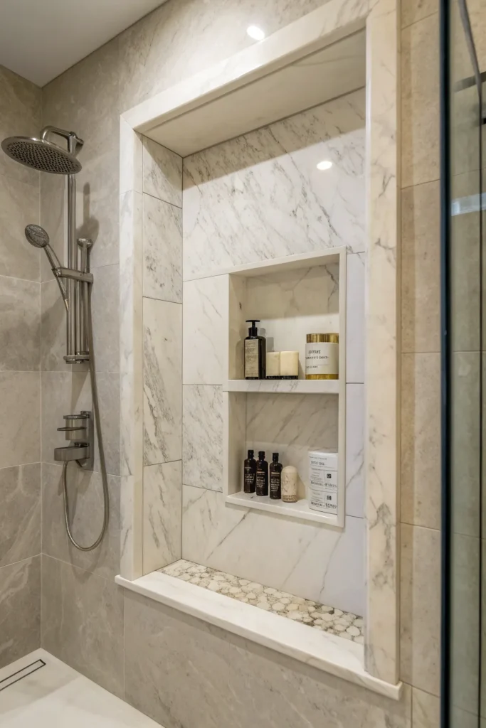 Replacing bulky shelves with thin stone or quartz shelves gives the niche a refined, custom appearance. These materials look substantial yet sleek, enhancing the overall luxury of the shower.