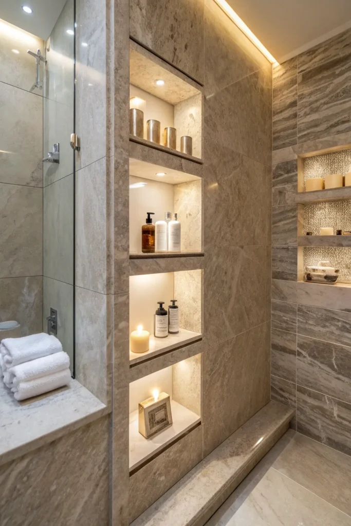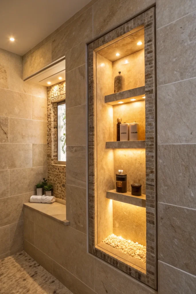 This feature is especially effective in darker showers or bathrooms with limited natural light. Warm-toned lighting enhances the spa-like atmosphere and makes the niche feel like a thoughtfully designed architectural feature.