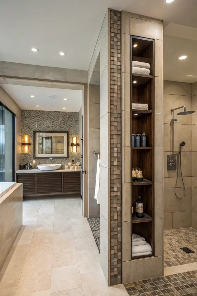 Instead of one large niche, vertically stacked smaller niches can create a boutique hotel vibe. This approach adds rhythm and architectural detail to the shower wall.