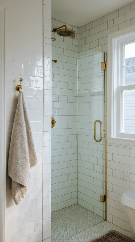 The white tile provides the shower’s clean, bright ground — the surface that reflects light most effectively and creates the visual freshness that the shower’s cleansing function most naturally suggests — while the warm brass introduces the metallic warmth that prevents the all-white shower from feeling clinical or cold.