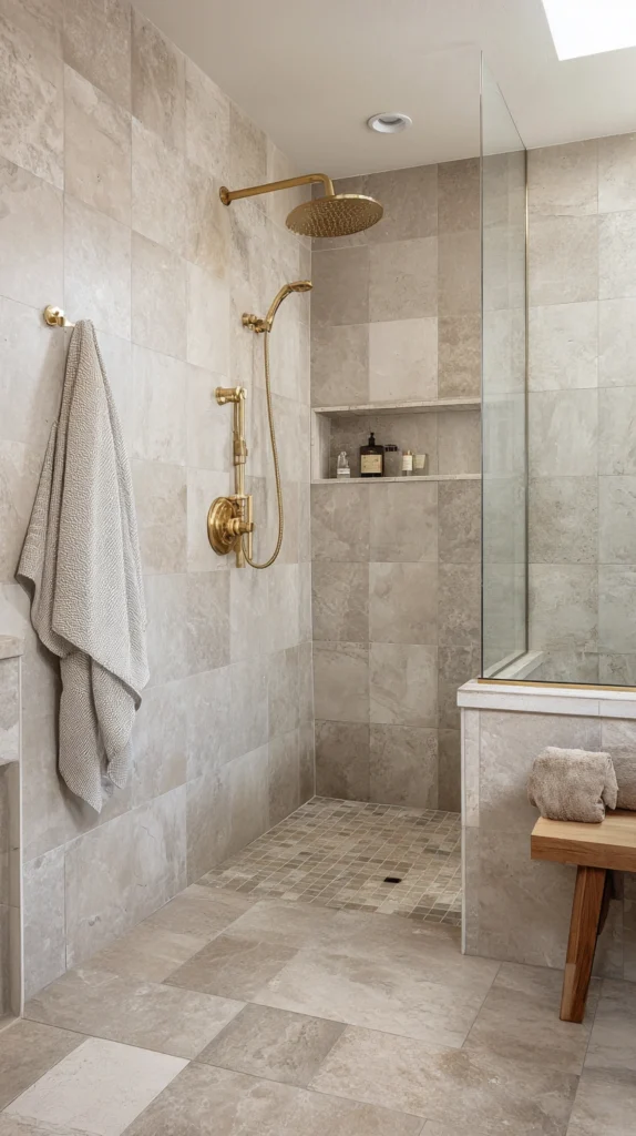 Greige — the warm gray-beige that occupies the neutral palette’s most sophisticated and most livable position, relating to both warm and cool surrounding colors without committing fully to either — in a matte, large-format tile with gold or champagne brass fixtures creates a shower of quiet, consistent sophistication that neither announces itself dramatically nor recedes into anonymity.