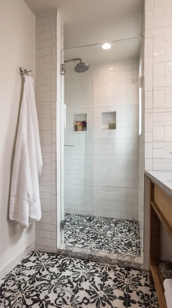 A black and white geometric tile — a hex, a diamond, a chevron, or a more complex geometric pattern — covering the shower floor or, in a bolder application, the shower walls, creates the most graphically assertive shower tile color combination available, one whose impact comes from the pattern’s energy rather than from the color palette’s depth.