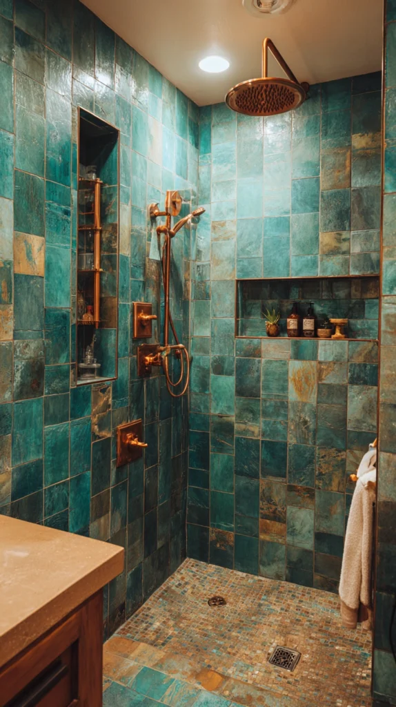 The teal and copper shower — teal or peacock blue-green tile on the shower walls with copper fixtures and copper-toned accessories — is the combination that draws from the Arts and Crafts and Art Nouveau color traditions most directly, referencing the specific pairing of blue-green and warm copper that characterizes the finest decorative arts of those periods with an eclecticism and a material warmth that more conventional combinations cannot approach.