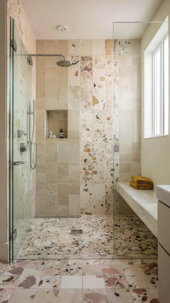 A warm nude tile — the pale, body-warm tone that reads as the skin’s color applied to a matte ceramic surface — combined with a terrazzo floor in a mix of warm pinks, creams, and gold fragments creates a shower of completely contemporary artisan quality whose material vocabulary references the Italian craft traditions of terrazzo with a design sensibility that is entirely of the present moment.