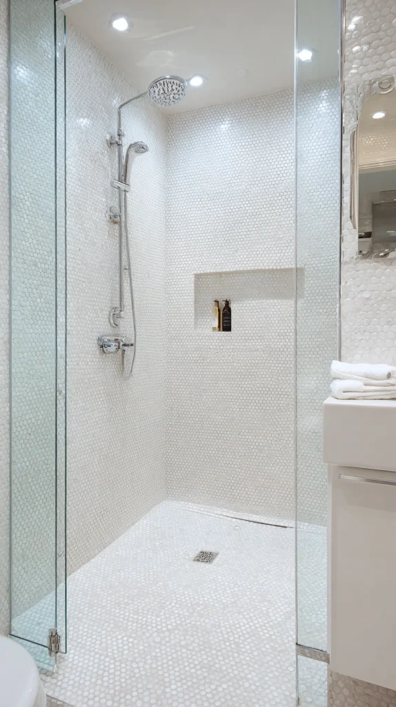 The pattern’s scale relative to the shower’s dimensions is the critical design decision: too small a pattern in a small shower creates a visual complexity that is exhausting; too large a pattern in a small shower creates awkward partial tiles at the perimeter.