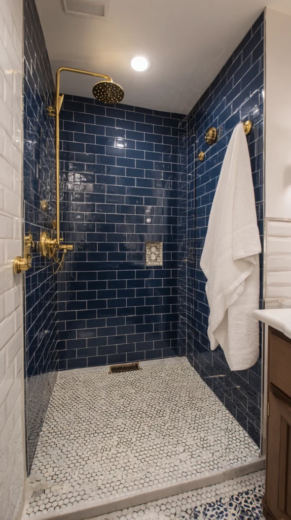 Brass fixtures in this combination create a three-material palette of navy, white, and gold that is among the most resolved and most universally admired shower color combinations available.