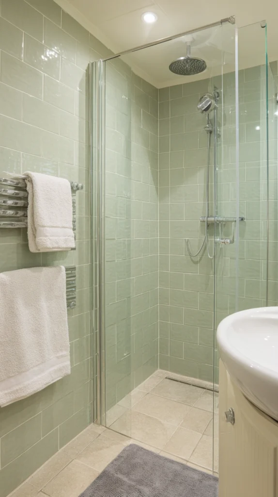 The sage green and cream shower — sage tile on the walls in a soft, slightly gray green, with cream or warm white grout and cream-toned ceramic accessories — creates a shower of extraordinary organic warmth that the bathroom’s typical white-and-chrome palette entirely lacks.