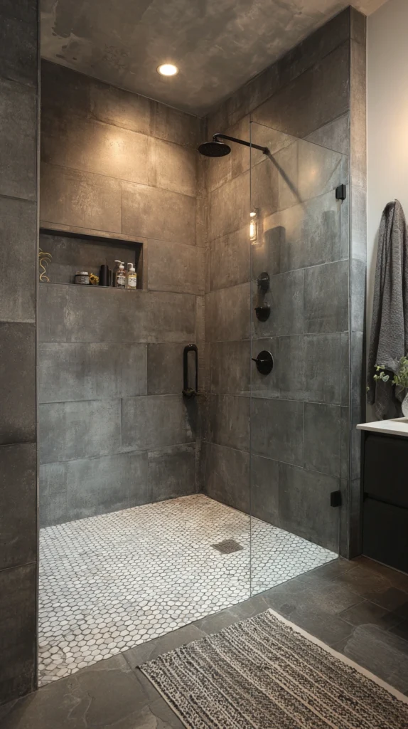 The charcoal and white shower — large-format charcoal tile on the walls with white penny round or small mosaic tiles on the floor — creates a shower of considerable dramatic impact whose dark walls and pale floor create the maximum possible tonal contrast within the shower’s enclosed space.