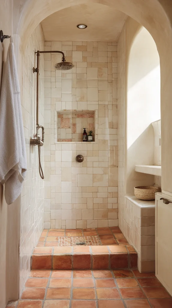 The terracotta and white shower — terracotta encaustic or plain terracotta tiles on the shower floor and lower walls with crisp white tiles above — creates a shower of immediate Mediterranean warmth and material authenticity that the standard bathroom tile palette entirely lacks.