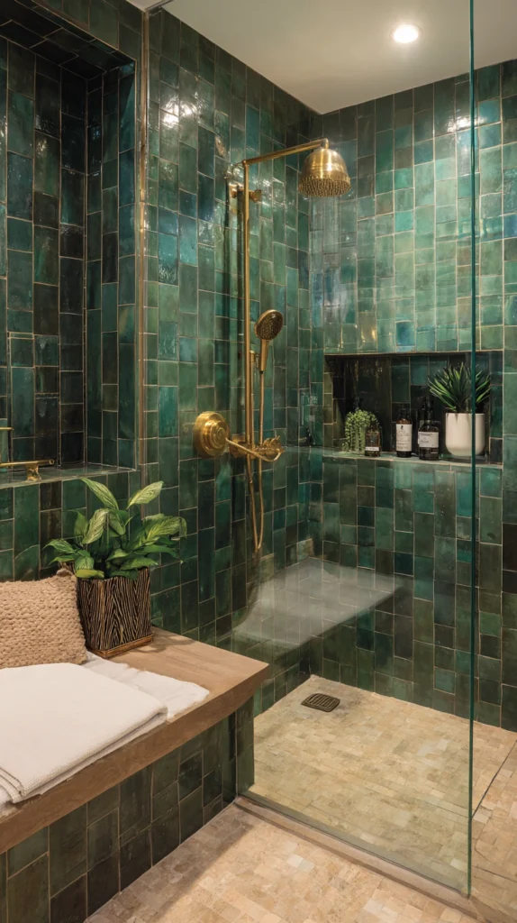 This combination references the most admired hotel spa environments of the contemporary luxury hospitality industry — the green-and-brass shower has become the signature aesthetic of the boutique hotel bathroom of significant design ambition — and its translation to the domestic shower requires the same commitment to material quality that the hotel context brings: proper tile of genuine ceramic depth, quality brass in an aged or unlacquered finish, and the restraint of a tile format that is simple enough to let the color do the work.