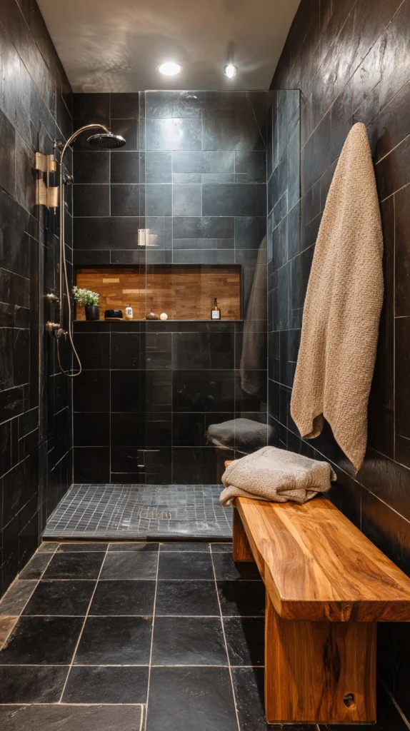 A black tile shower — walls in a matte black ceramic or porcelain of adequate quality to read as rich rather than flat — combined with warm timber elements within the shower: a teak bench, a timber shower niche, a timber shower mat at the floor — creates a shower of industrial warmth whose dark tile and natural wood create the specific material tension of the loft aesthetic applied to the bathroom’s most intimate space.