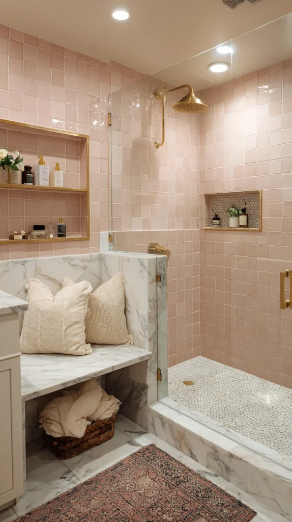 Blush pink tile — a ceramic or encaustic tile in the soft, slightly gray pink that occupies the chromatic territory between white and rose — combined with marble detailing on the shower niche, the bench, or the floor creates a shower of soft luxury whose warmth and femininity are resolved by the marble’s geological authority and material complexity.
