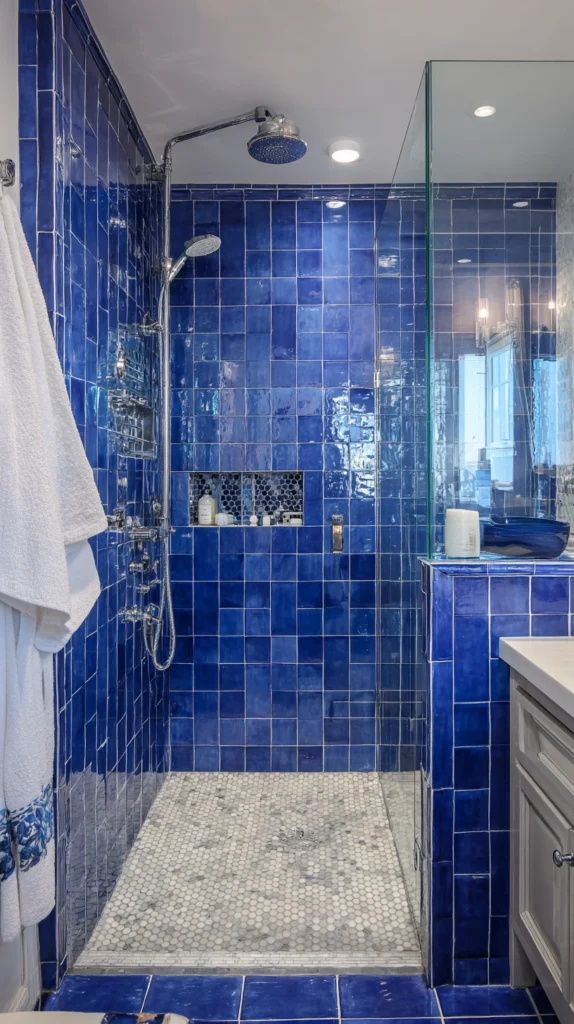 A cobalt blue shower — its walls in the saturated, clear blue of Mediterranean azulejos, of Moroccan zellige, of the specific blue that carries maximum chromatic energy without the coolness of navy or the indirection of teal — with white grout and white ceramic accessories creates a shower of immediate, energizing vitality that the most color-committed bathroom owners choose for the specific quality of visual and psychological stimulation it provides each morning.