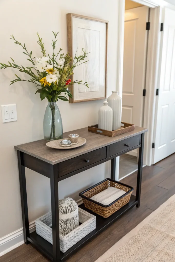 One of the most important aspects of simple entryway table décor is regular editing. Remove unnecessary items, reorganize essentials, and refresh greenery occasionally. Keeping the décor intentional ensures the entryway always feels welcoming, tidy, and thoughtfully styled.