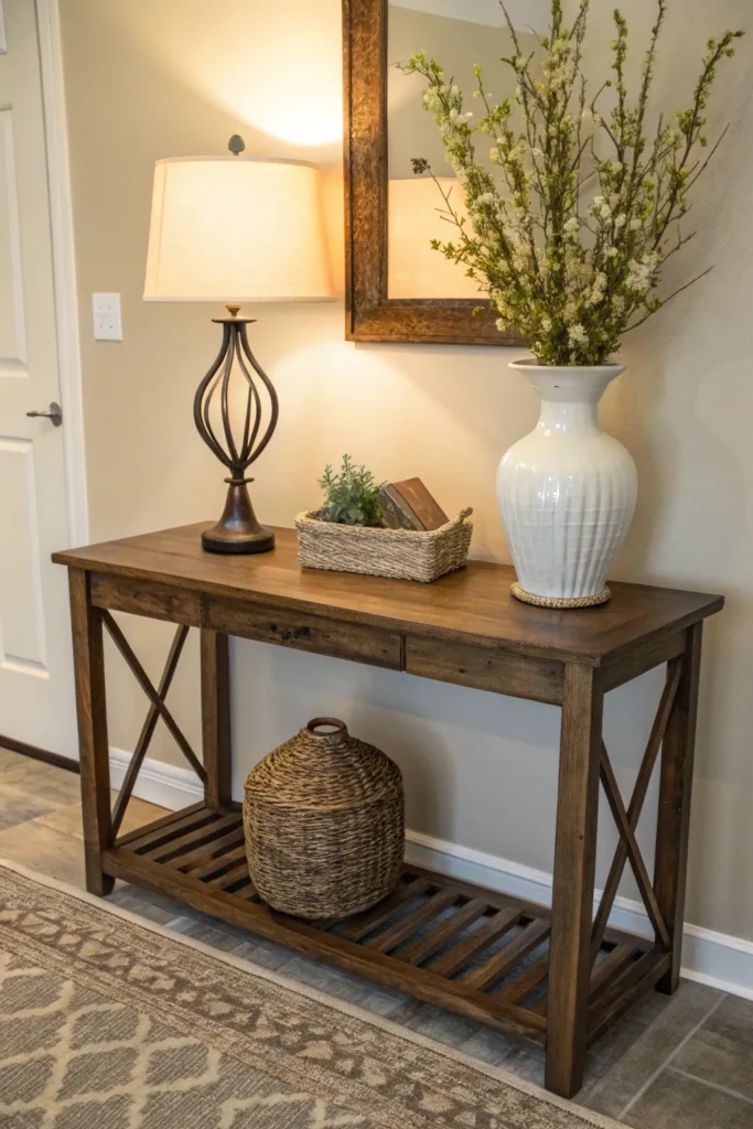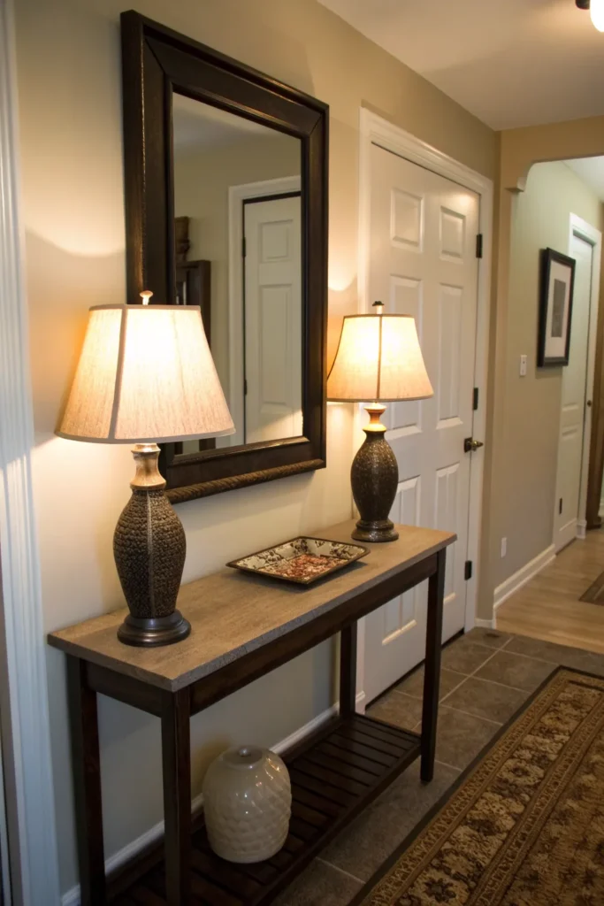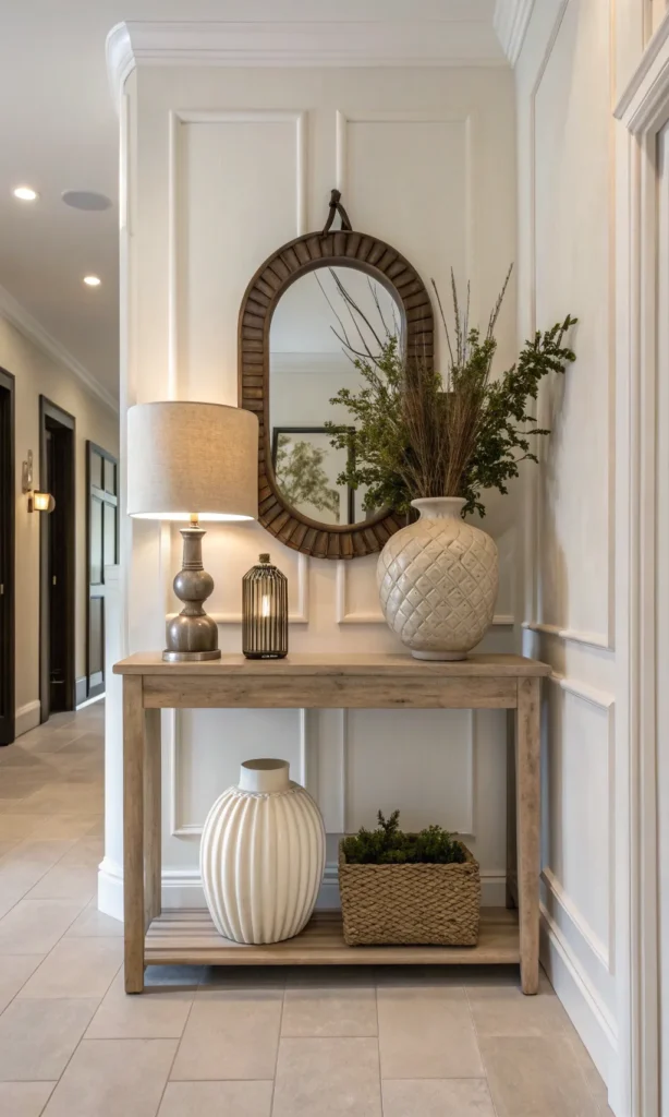 Balance is essential in simple entryway table décor. While symmetry isn’t required, visual balance helps the space feel intentional. For example, place a lamp on one side and a vase or sculpture on the other. This creates harmony without making the arrangement feel rigid or overly styled.