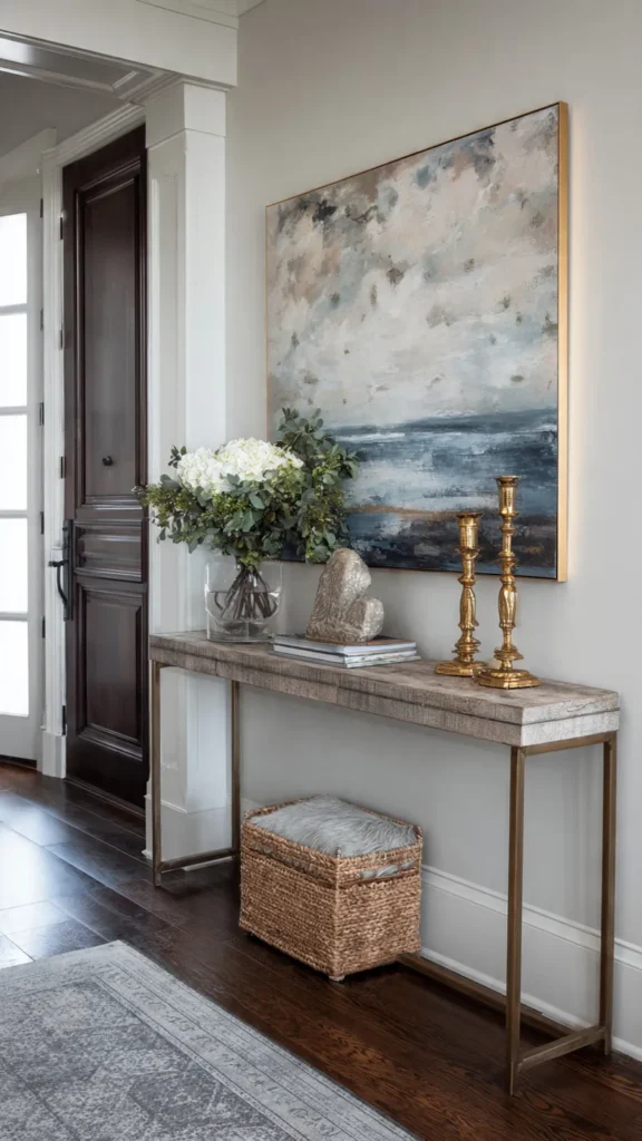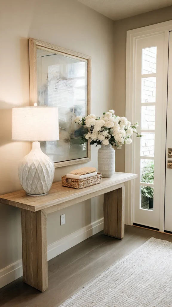 A minimalist entryway table instantly creates a calm and organized first impression. Choose a few essential décor items instead of crowding the surface. A small vase, a simple tray, and one decorative accent are often enough. Leaving some empty space on the table allows each item to stand out while maintaining a clean and uncluttered look that feels effortlessly stylish.