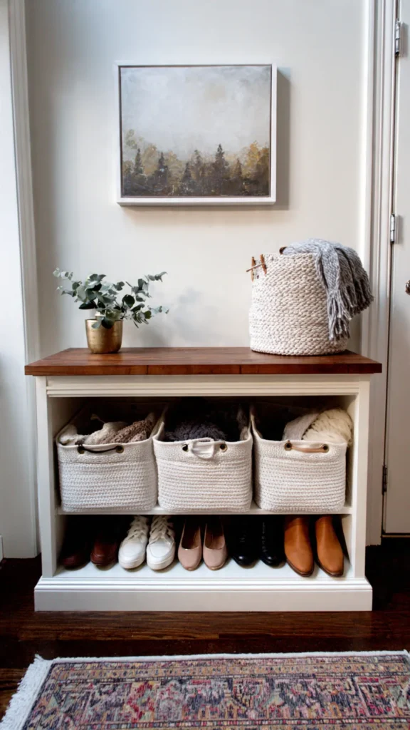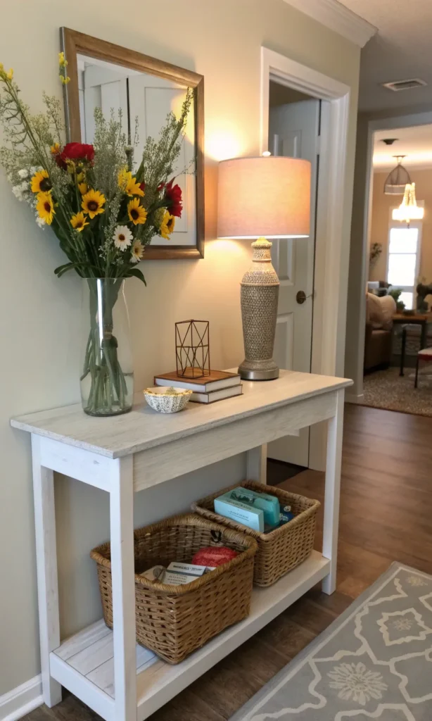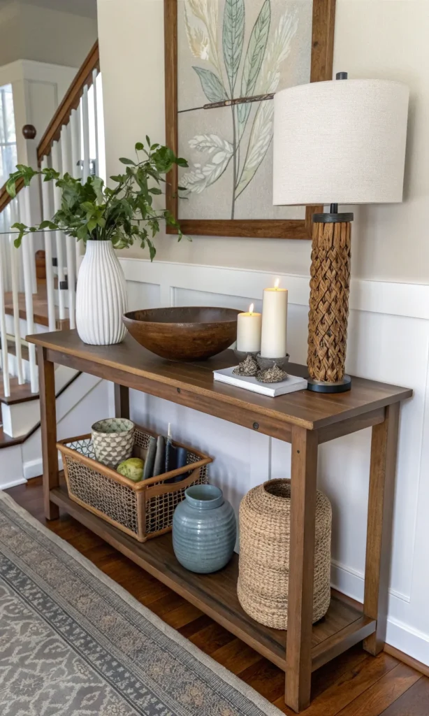 Decorating under the entryway table is just as important as styling the top. Baskets or bins provide hidden storage for shoes, scarves, or bags while keeping the area tidy. Choose woven or fabric baskets in neutral colors to maintain a simple and cohesive look. This approach adds function without compromising style.