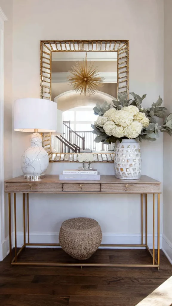 A mirror is one of the easiest ways to elevate entryway table décor. It reflects light, makes small entryways feel larger, and adds visual interest without clutter. Choose a simple round or rectangular mirror with a slim frame to keep the look modern and clean. A mirror also serves a practical purpose, allowing quick outfit checks before heading out.