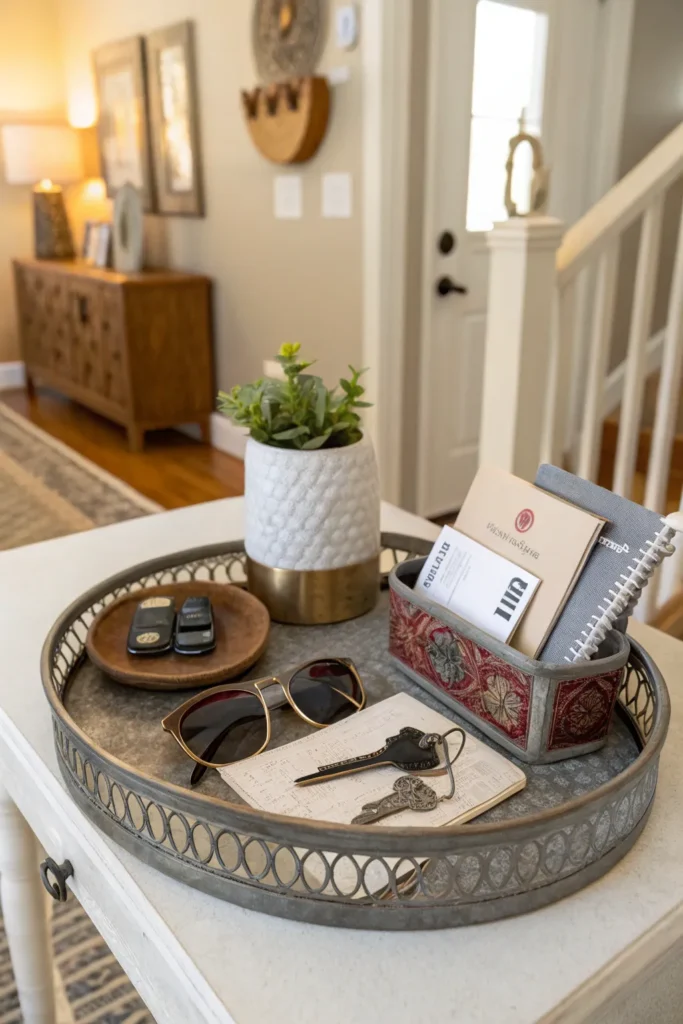 Decorative trays are perfect for combining style with function. Place a tray on your entryway table to hold keys, wallets, sunglasses, or mail. Opt for materials like wood, metal, or ceramic in neutral tones to keep the décor simple. A tray helps define a specific area on the table while preventing small items from looking messy.