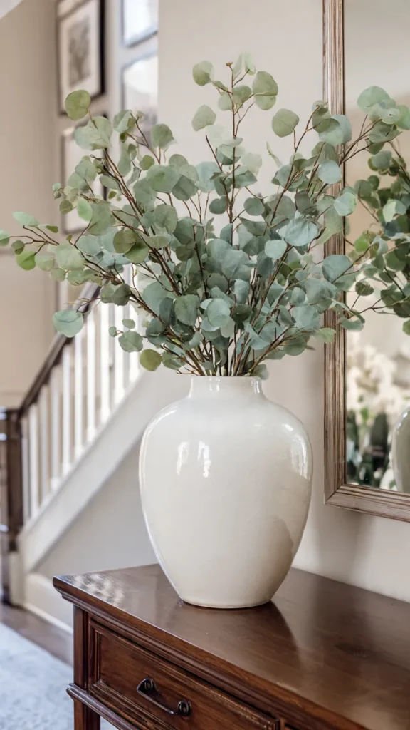 A vase with greenery is a timeless and easy entryway table décor idea. Fresh flowers, eucalyptus stems, or faux branches instantly add life and softness to the space. Choose a vase with a clean shape and neutral color to maintain simplicity. Greenery brings a natural touch that feels welcoming without overpowering the décor.
