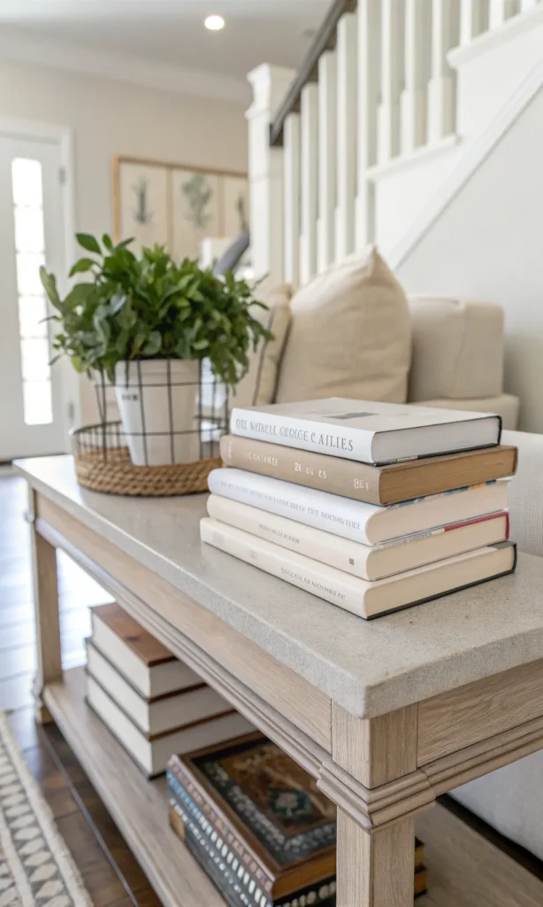 Books are an easy way to add height and personality to an entryway table. Stack two or three neutral-toned books to create a clean and polished look. You can place a small decorative object or candle on top of the stack for added interest. Keep book choices simple to avoid visual clutter.
