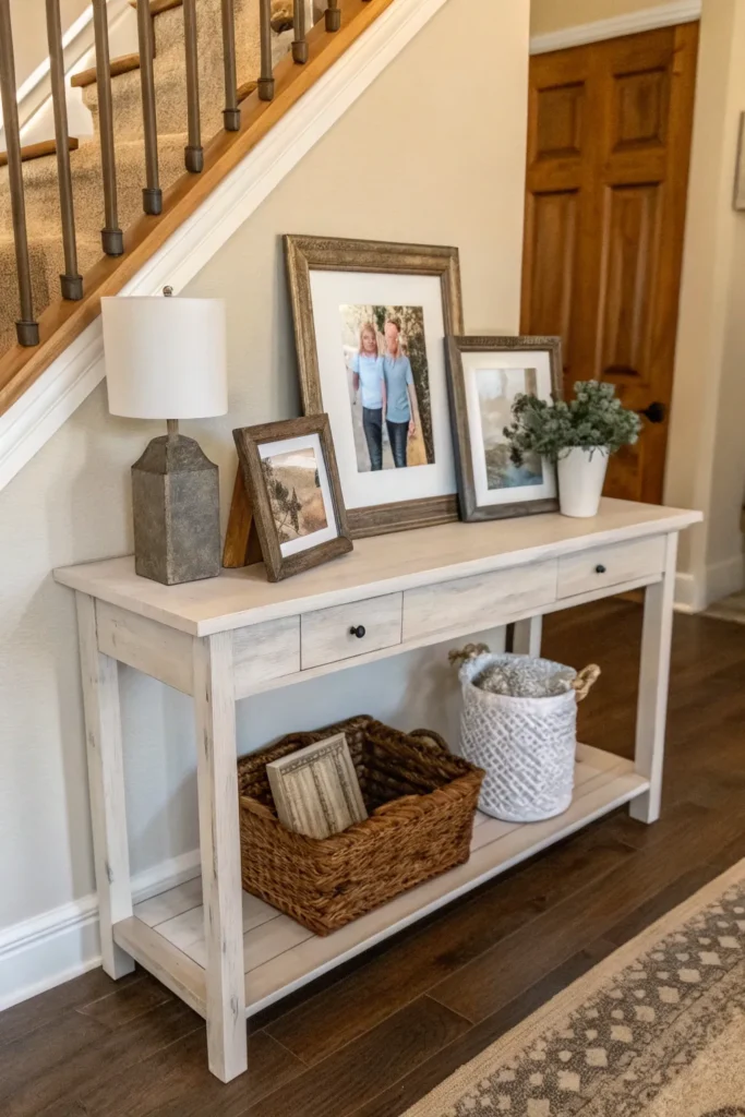Personal touches make your entryway feel warm and lived-in. Frame a small family photo, a meaningful quote, or a travel print and place it on the table. Keep frames simple and avoid overcrowding. One or two personal items are enough to add character while keeping the décor clean and modern.