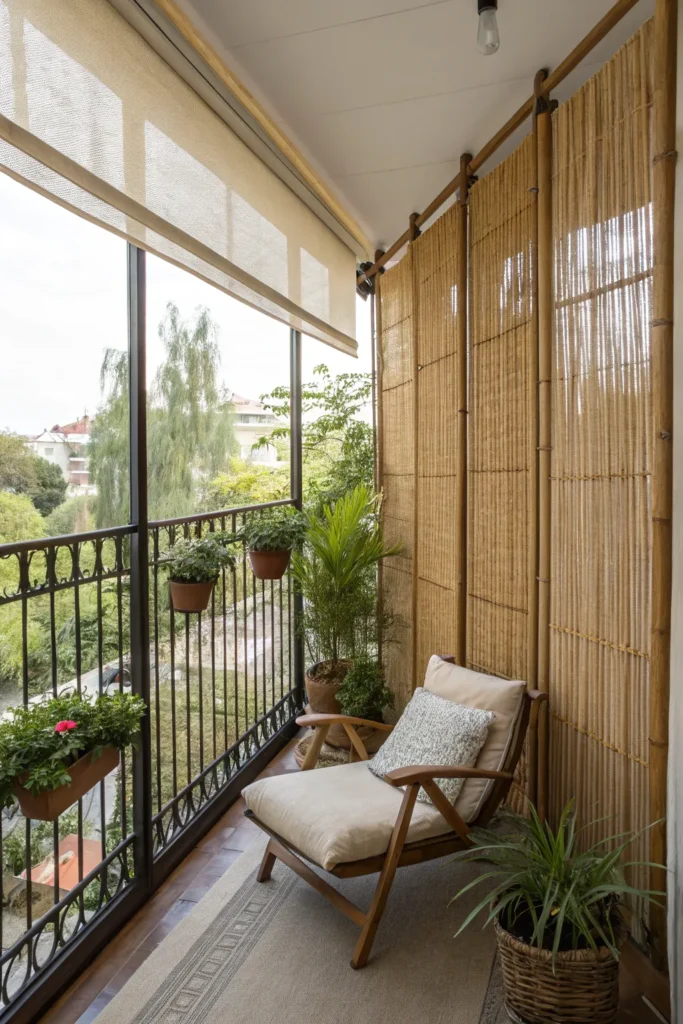 Many apartment balconies face neighbors or busy streets, making privacy a common concern. Instead of solid barriers that block light, opt for lighter solutions like sheer outdoor curtains, bamboo screens, or tall plants.