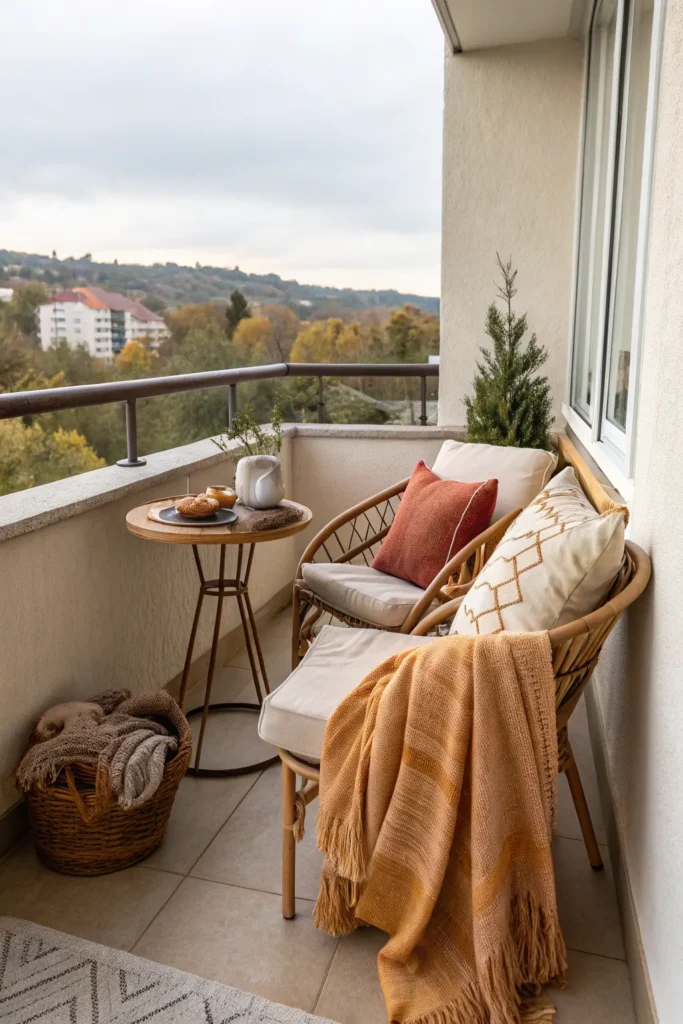Textiles are an easy way to add comfort and personality to a small balcony. Cushions, throws, and seat pads soften hard surfaces and make the space more inviting.