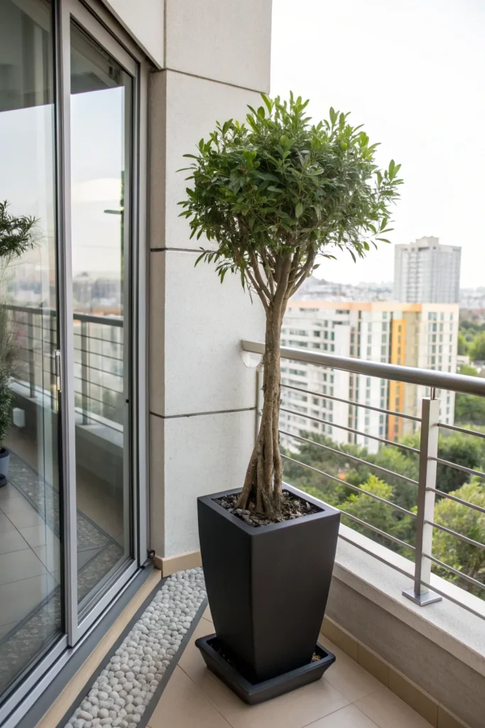 You can also use tall, narrow plant stands or ladder-style shelving to create height and visual interest. This draws the eye upward, making the balcony feel larger and more dynamic while keeping the layout open and uncluttered.