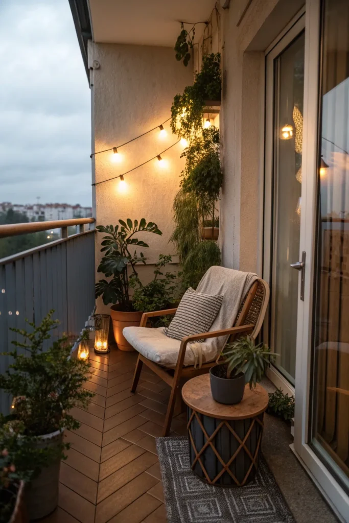 Lighting can completely transform a small balcony, especially in the evenings. Soft, warm lighting makes the space feel cozy and inviting, encouraging you to use it beyond daylight hours.