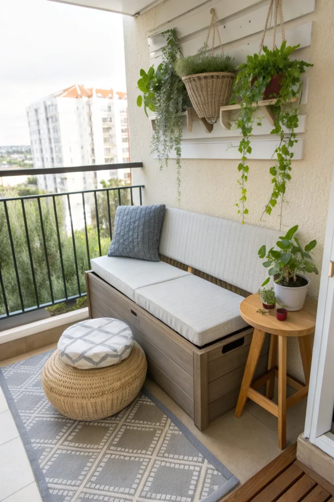 If traditional furniture feels too bulky, floor seating can be a great alternative. Outdoor floor cushions, poufs, or a low bench with soft pillows create a relaxed, cozy vibe that works beautifully in small balconies.