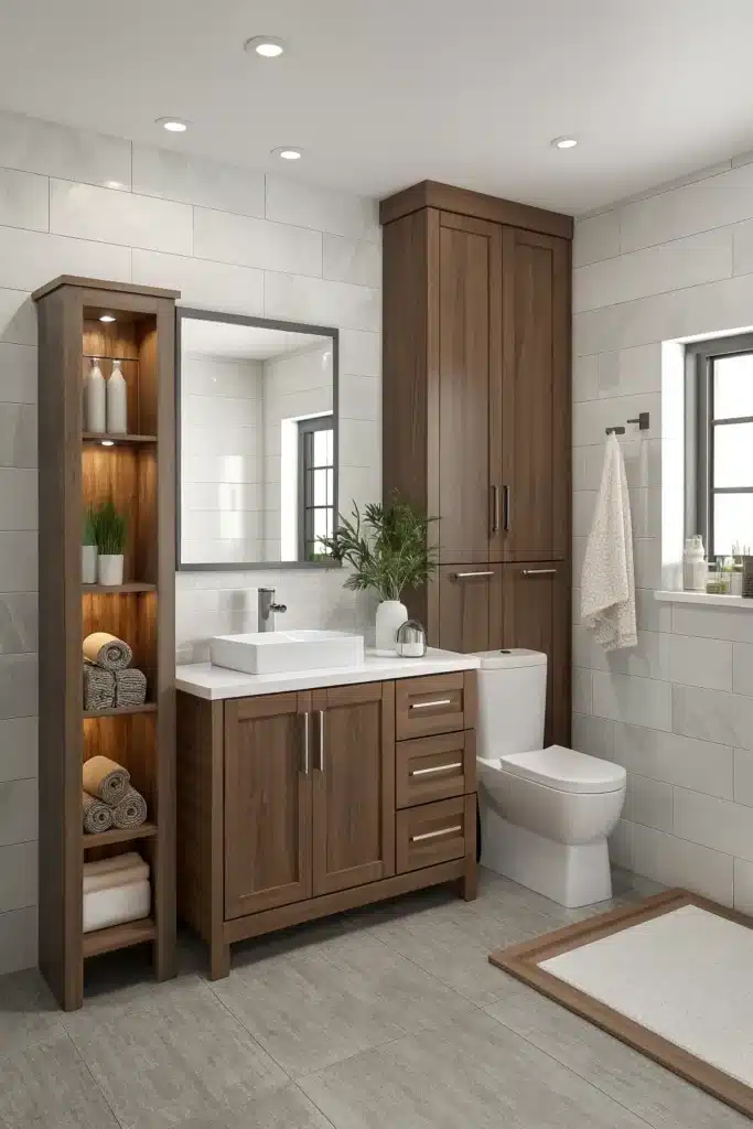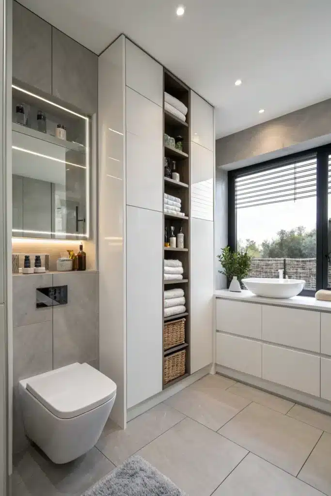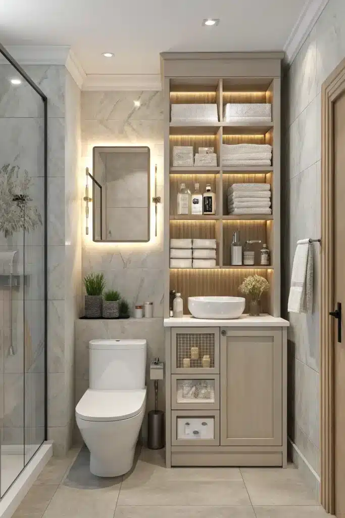 Transform your bathroom walls into storage powerhouses by utilizing every inch of vertical space from floor to ceiling.